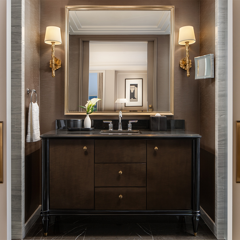 Designed to feel residential and serene, the rooms unfold in a calming sequence. Guests enter into a dedicated wardrobe area that immediately absorbs luggage and visual clutter, leaving the living spaces composed and quiet. “You settle into the wardrobe area right away,” Romaniello explains. “It keeps everything soothing. It feels neatly and calmly arranged.” Windows were expanded and rebuilt as triple-panel systems, bringing in more light while buffering the bustle of Midtown. The palette stays light and neutral, with subtle Art Deco references in fixtures and details rather than heavy-handed motifs. In the bathroom, a generous soaking tub and polished finishes are meant to deliver a spa-like ritual without leaving the room.